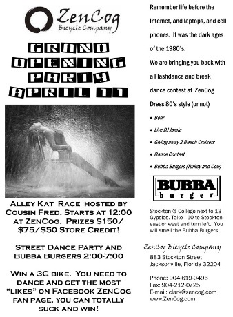 I hope you are making plans to join Bike Jax sponsor and just all around damn nice bike shop ZenCog Bicycle Company for their Grand Opening party this Sunday starting around noon.