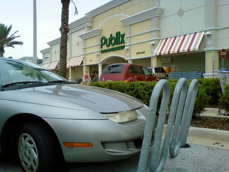 This may not be the fault of Publix but more on the side of property owners. Despite my preference to see more bike racks placed in front and center locations like this and not in the back of business by the trash cans and grease pits. This rack is placed in the back third of a standard parking space and is not visible until a driver is already turning into the spot. The space itself doesn't have any markings or signage to separate it from all the other spaces other than the bike rack. The rack as you can see from the picture above has had to suffer more than one attempt from cars to push it out of the way. Presumably so the owner of the vehicle doing the pushing can get the back half of their vehicle that is blocking the roadway out of the way. And when the rack refuses to move the vehicle owners give up like the one pictured above and goes on with their day, inconveniencing everyone that needs to walk or drive past their car and any cyclists that would like to use the rack for its intended purpose.
